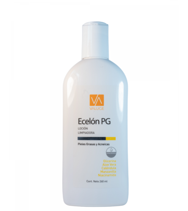 ECELÓN PG es una loción limpiadora libre de grasas y jabones, formulada para lograr una limpieza efectiva y no agresiva de las pieles mixtas y oleosas. ECELÓN PG es ideal para la limpieza de la piel de los pacientes que estén cursando tratamientos dermatológicos. ECELÓN PG es un aporte al tratamiento de pacientes con dermatitis seborreica o acné dado que contribuye al balance del pH y elimina el exceso de sebo.