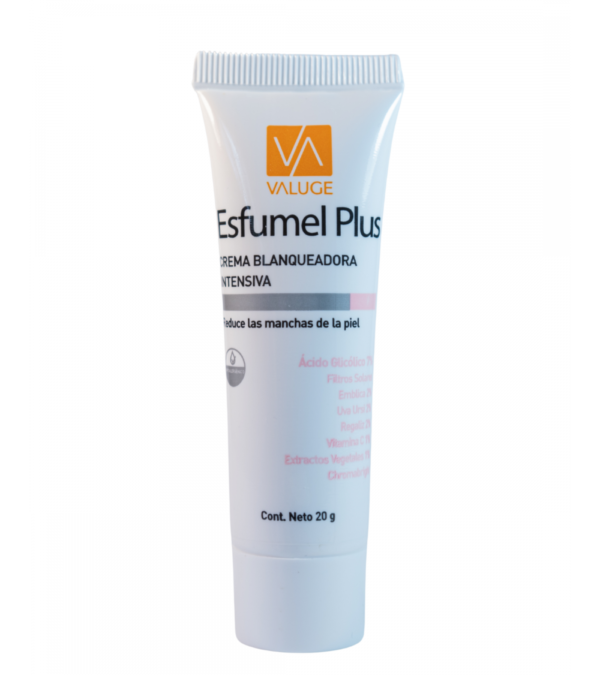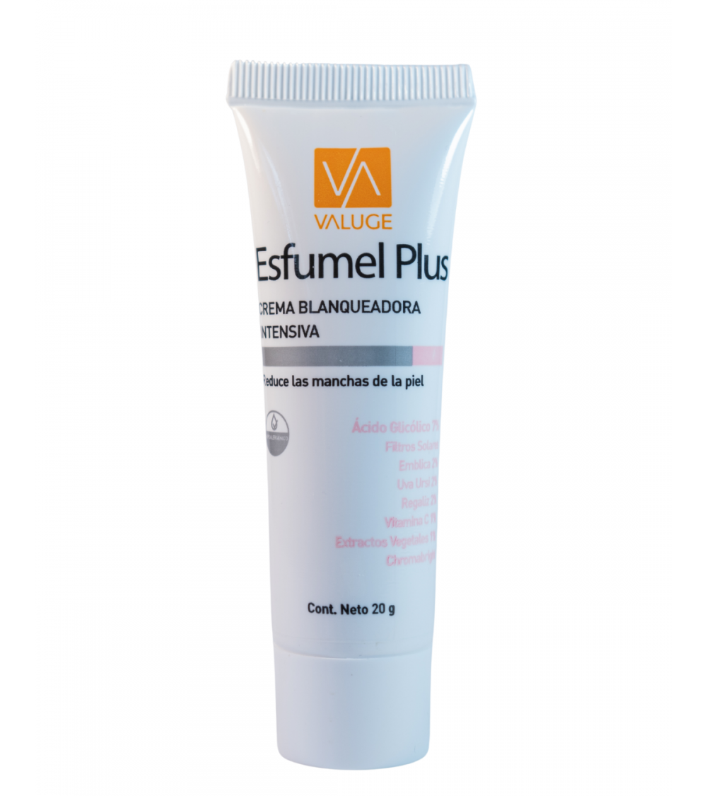 PROPIEDADES: Esfumel Plus es una crema formulada para el tratamiento de las manchas de la piel asociadas al fotoenvejecimiento cutáneo o a hiperpigmentaciones de cualquier origen. Las alteraciones pigmentarias en forma de lentigines o léntigos que se observan en las áreas expuestas crónicamente a la exposición solar se aclaran con el uso sostenido y en forma progresiva.