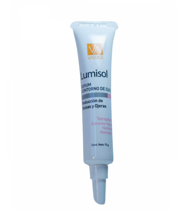 PROPIEDADES: LUMISOL® SERUM para CONTORNO DE OJOS, es un serum para el cuidado del contorno de ojos, especialmente indicado en las bolsas de los mismos. Su exclusiva formulación asegura la eficacia sumada a una excelente tolerancia. A medida que la piel se va debilitando con los años, la flaccidez en la zona de los párpados produce el aspecto de bolsas. También el edema producto de múltiples causas, pero fundamentalmente como resultado del aumento de la permeabilidad vascular o deficiencias en el drenaje linfático, produce un efecto de hinchazón en tejidos laxos como los del párpado. LUMISOL® SERUM para CONTORNO DE OJOS contiene Eyeseryl®. Eyeseryl® es un tetrapéptido de reconocida eficacia en la reducción de bolsas de ojos y ojeras. Su comprobada acción antienrojecimiento, permite el drenaje que controla la hinchazón asociada a este problema cosmético. A este efecto se suma una mejoría de la elasticidad de la piel y una mayor suavidad de la piel periocular. Eyseryl® ha demostrado una inhibición de las reacciones cruzadas con el colágeno. La inhibición específica de la glicación del colágeno previene la pérdida de elasticidad y por consiguiente la formación de las bolsas de los ojos. Eyeseryl® ha demostrado in vitro inhibir la permeabilidad vascular de manera dosis dependiente. Favoreciendo un efecto de drenaje y antiedema. Estudios in vivo en voluntarios demostraron un cambio notorio en la reducción de los signos que se evidencian a partir de los 14 días con una solución al 10%. La elasticidad de la piel medida por un cutómetro aumentó un 30% en 30 días. En otro estudio en voluntarios se utilizó una crema al 1%, dos veces por día durante 28 días. En el 70 % de los sujetos se evidenció una disminución de las bolsas. Además mediante estudios de tipificación del color de la piel mediante cromametría se demostró un efecto blanqueante sobre las ojeras.(*) LUMISOL® SERUM para PARPADOS contiene Sepilift®. Sepilift® es un aminoácido simple derivado de una planta conocido como dipalmitoyl hydroxyprolina. Su acción se debe a la inhibición de la síntesis de metaloproteinasas comprometidas en la ruptura de las fibras de colágeno. La consecuencia es una mejoría en los efectos del envejecimiento de la piel, mejorando la apariencia de la misma y dándole mayor elasticidad y suavidad. Disminución de arrugas superficiales y emoliencia otorgan a la piel un aspecto más saludable. LUMISOL® SERUM para CONTORNO DE OJOS contiene nicotinamida. Esta amida hidrosoluble del ácido nicotínico interviene en numerosas reacciones de óxido-reducción en las que actúa fundamentalmente como antioxidante. Es un componente de las dos coenzimas más importantes de nuestro organismo (NAD y NADP). Se ha utilizado en forma tópica en diversas enfermedades dermatológicas. Se le atribuye un efecto depigmentante por su acción de interferir en la transferencia de melanosomas hacia los queratinocitos. Este es un proceso reversible y dependiente de la dosis. Mejora además otros problemas asociados al envejecimiento como la textura de la piel y las arrugas finas. La exclusiva combinación de estos tres componentes principales aseguran una acción significativa en la corrección de las bolsas y ojeras y en la prevención de las mismas a largo plazo con el uso diario de LUMISOL® SERUM para PARPADOS.