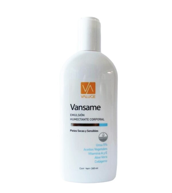 PROPIEDADES: VANSAME es una emulsión/crema humectante, especialmente desarrollada para aplicar en pieles secas y sensibles. VANSAME favorece la retención de la humedad, permitiendo restaurar y/o mantener la hidratación normal de la piel. VANSAME se absorbe con rapidez, sin dejar residuos grasos, provocando una perceptible sensación de suavidad en la piel. No contiene lanolina ni sus derivados.